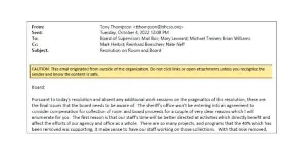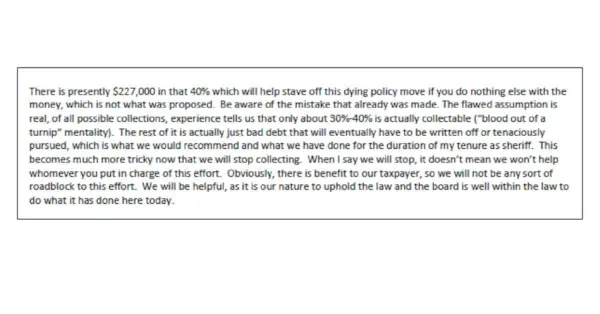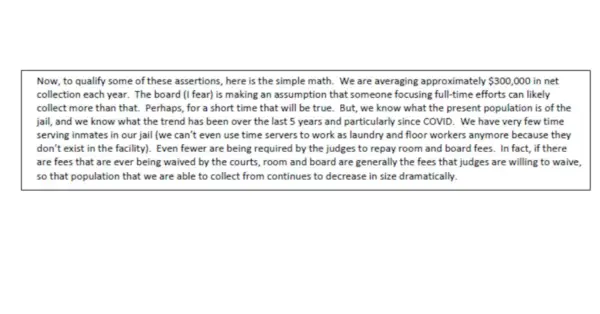 De indiening bevatte een e-mail van Thompson aan de Raad van Toezicht, waarin de sheriff erkende: 'Als er vergoedingen zijn waarvan de rechtbanken ooit kwijtschelding verlenen, zijn kost en inwoning over het algemeen de vergoedingen waar rechters bereid voor zijn kwijtschelding te verlenen, zodat de bevolking waarvan we kunnen innen nog steeds dramatisch in omvang afneemt.'